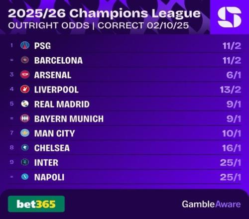 欧冠联赛阶段2轮战罢,目前拜仁、皇马、巴黎圣日耳曼、国际米兰、阿森纳、卡拉巴赫6支球队保持全胜。最新夺冠赔率榜上,卫冕冠军巴黎与刚刚成为自己手下败将的巴萨同为6.5,领跑群雄,其后是阿森纳7、利物浦7.5、皇马10、拜仁10、曼城11、切尔西17。 不过,OPTA的测算结果与赔率不同:巴黎和巴萨都要靠后站,夺冠概率最高的是阿森纳,达到18.1%,其后是利物浦14.7%、巴黎14%、曼城9.7%、拜仁9.5%、巴萨8.3%、皇马4.9%。
