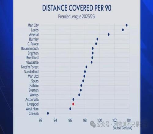 本赛季英超各队场均跑动距离,曼城高居第一,而利物浦,你可能难以置信,仅排倒数第三。
