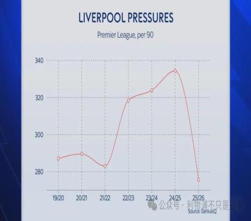 上赛季利物浦的逼抢次数超过此前5个赛季,但本赛季却急剧下滑到7个赛季以来的最低值。