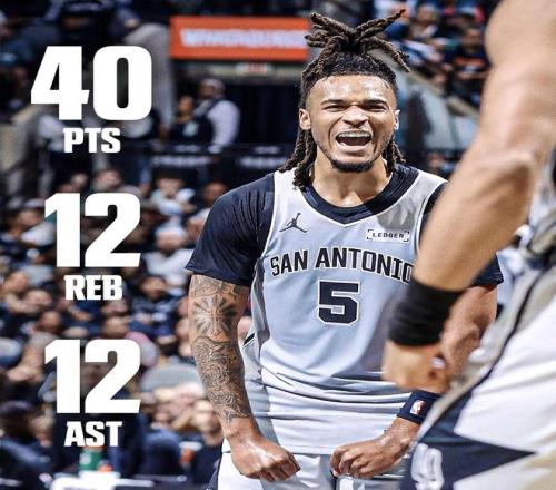 这场比赛,马刺后卫卡斯尔打出了生涯之夜:全场出战31分钟,投篮19中15,三分5中3,罚球10中7,拿下40分12篮板12助攻3抢断。